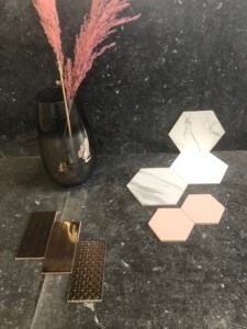 In dit moodboard hebben wij wat verschillende stijlen gecombineerd. Als ondergrond de prachtige keramische Belgisch hardsteenlook met onderop een echte eycatcher. De Metal Graffiti copper mix. Deze tegel heeft verschillende patronen en kan bij verschillende kleuren lichtval koperkleurig lijken of goudkleurig. Ook gebruikte ik 2 verschillende soorten hexagon. De Good vibes pink 14×16 cm en de Codicer Calacatta 25×22 cm. Zou jij deze combinatie ook toepassen of zou je juist een hele andere kleur toevoegen? Laat het ons weten onder onze instagram post en wie weet zie je jouw eigen idee de volgende keer terug in ons nieuwe moodboard.