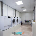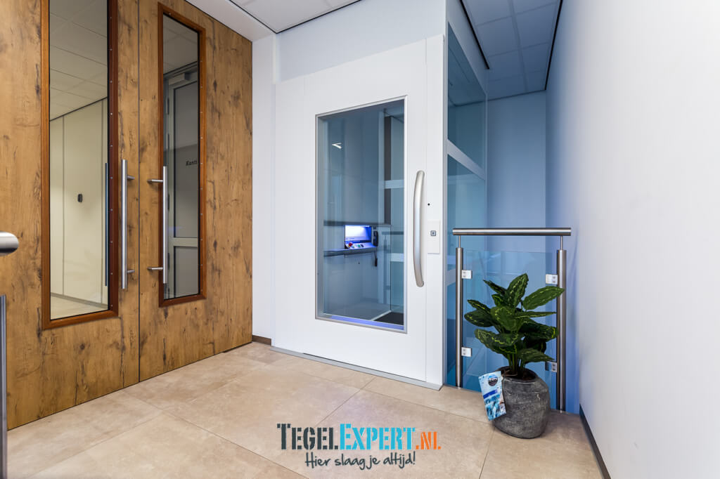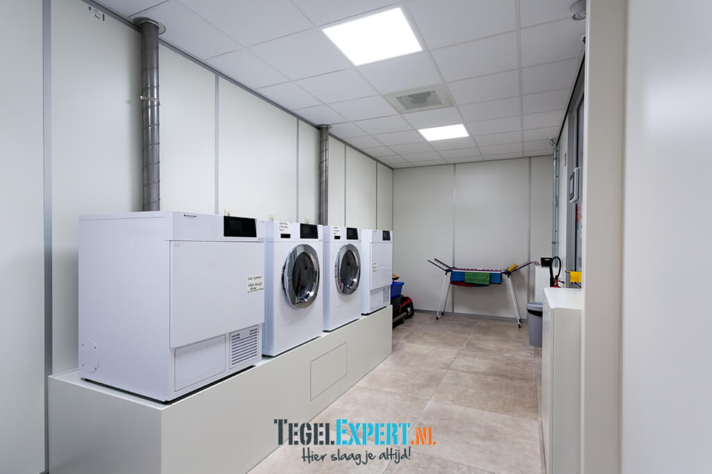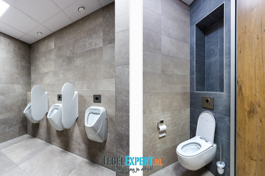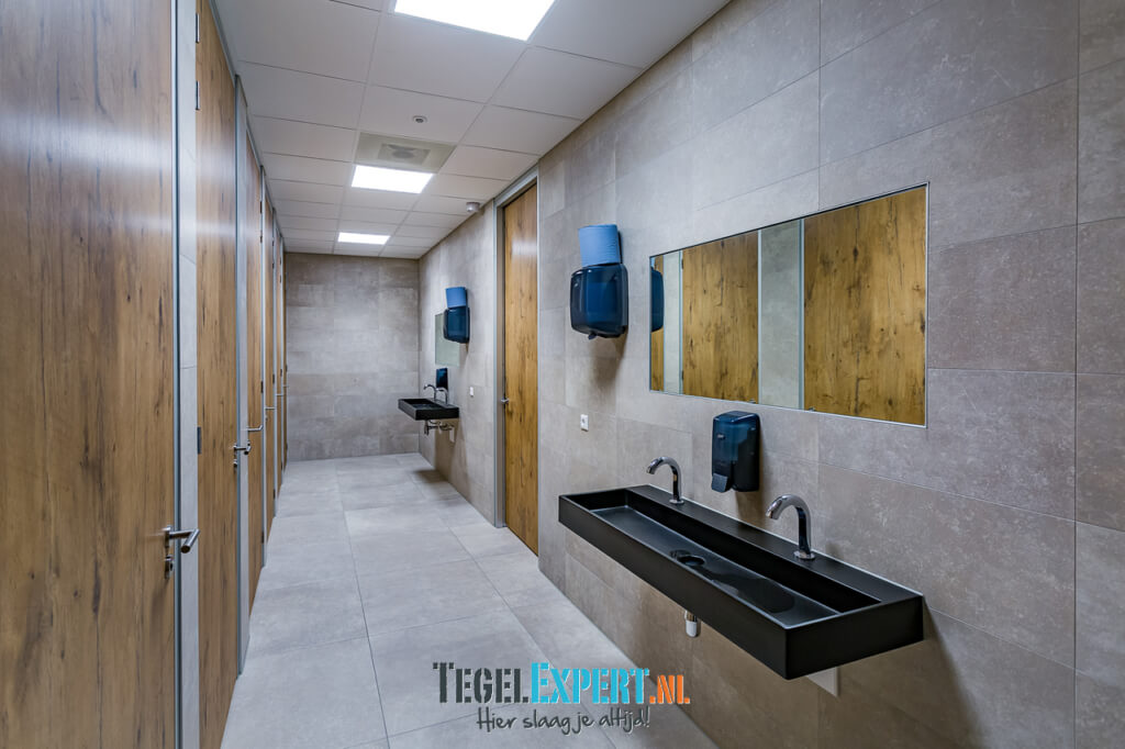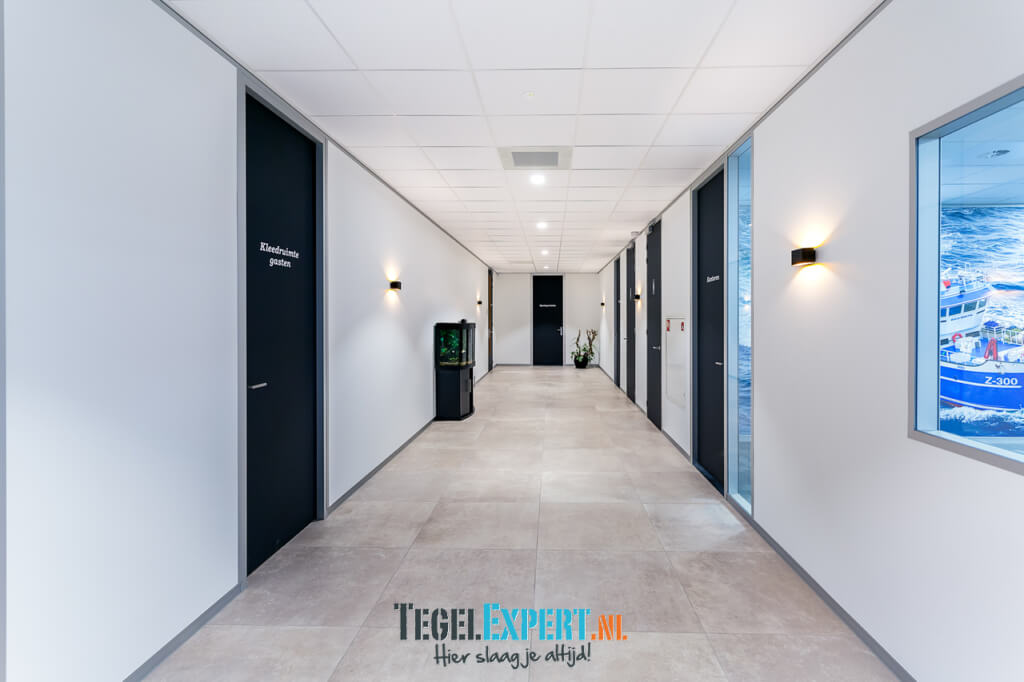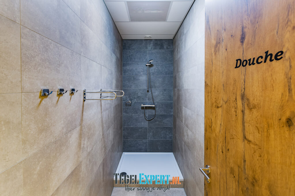 De basis van de tegels op de vloeren is een zandgrijze tint in het tegelformaat 80×80 cm. Dit grotere formaat tegel komt prachtig tot zijn recht in elke ruimte. Voor de wand is een 30×60 cm formaat tegel gebruikt. Om hier en daar accenten te leggen is gevarieerd met tegelkleuren.