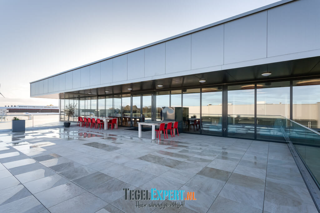 Doordat het terras ook is uitgevoerd met een keramisch terrastegel in dezelfde stijl is een mooie doorloop van binnen naar buiten gecreëerd. Voor advies over het betrekken van je terras bij je woning of pand kan je onze blog met terras tips lezen. [link naar blog terrastegels]