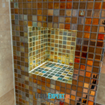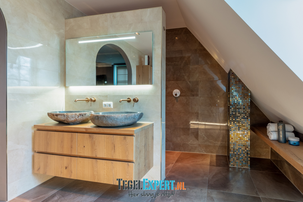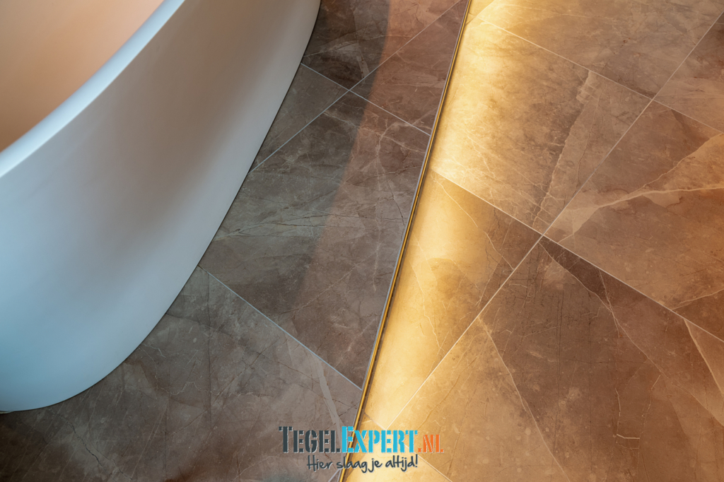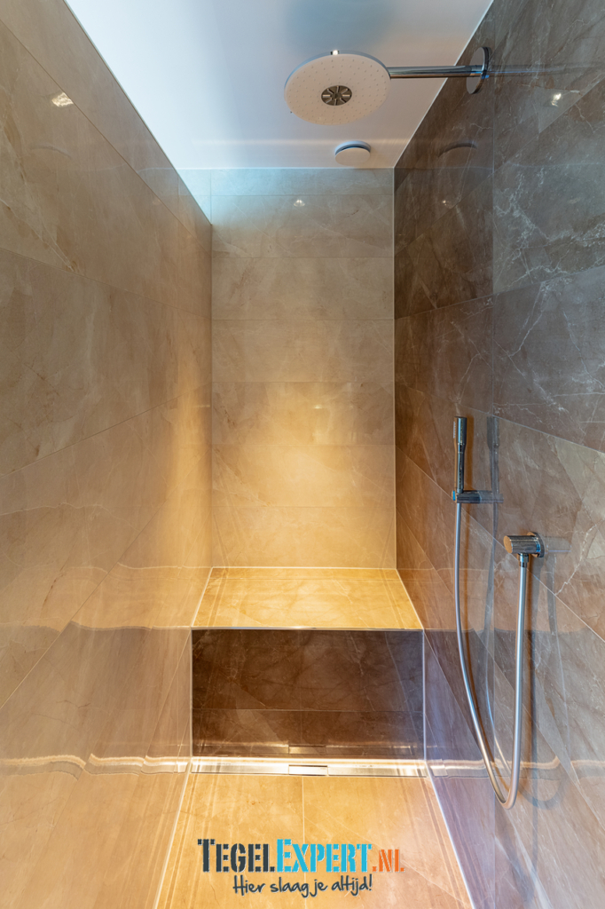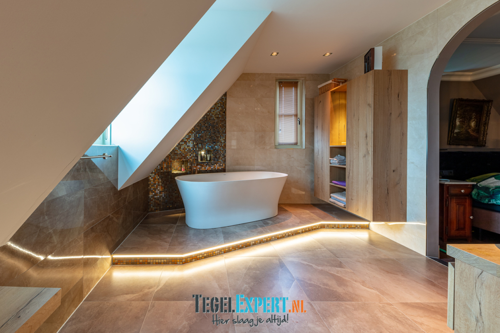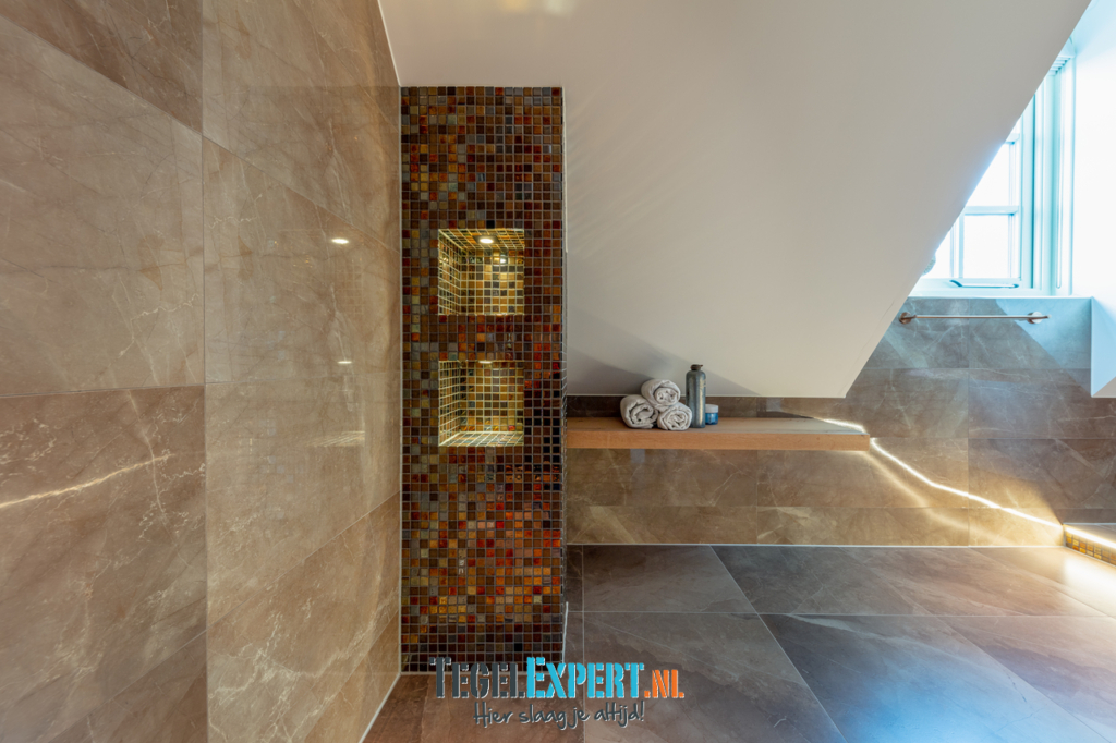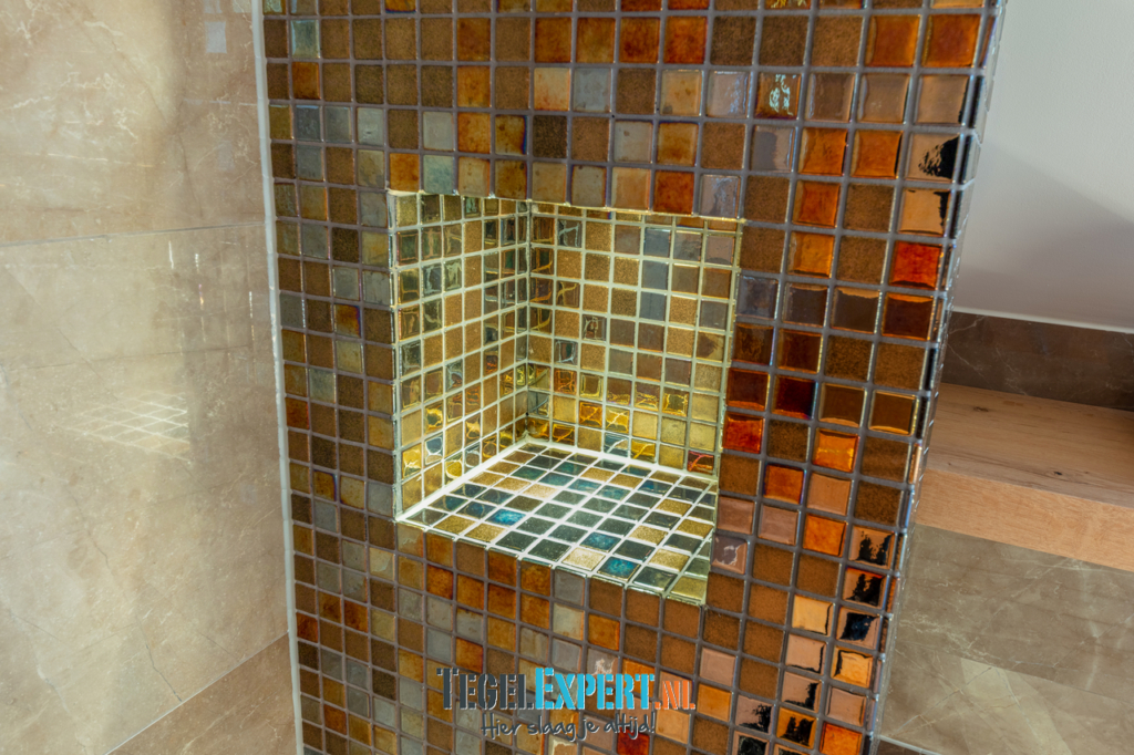 De badkamer heeft met zijn hoogglans tegels, prachtige mozaïek en ledverlichting een mooie luxe glamouruitstraling. Wat een origineel idee van de klant om op die manier verlichting aan te brengen rondom het bad.