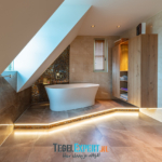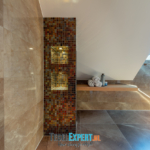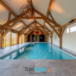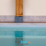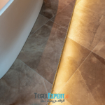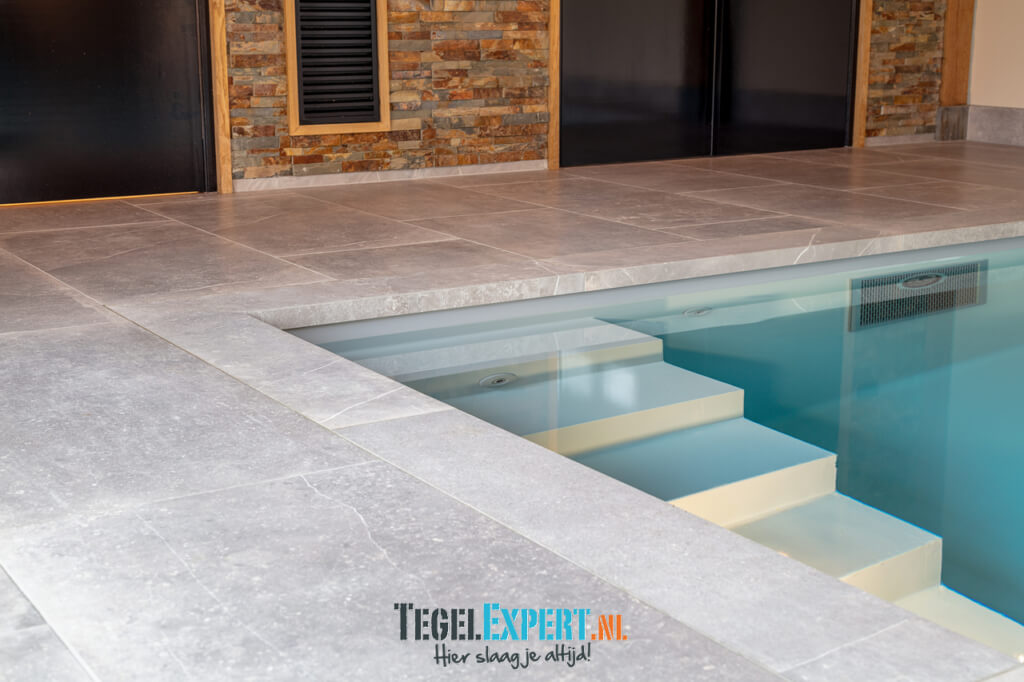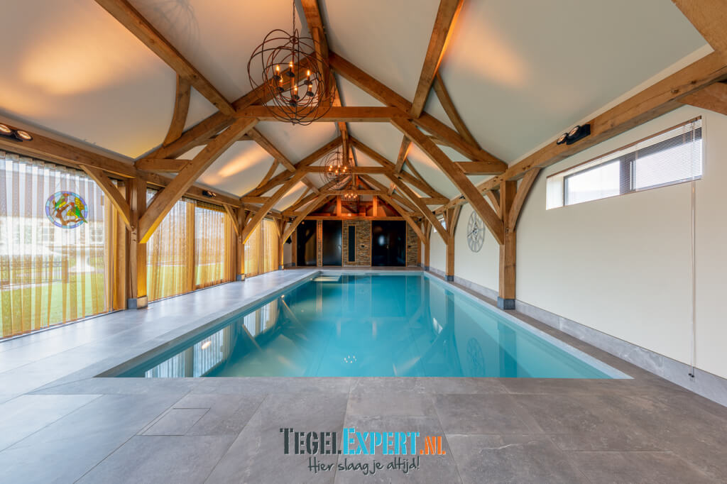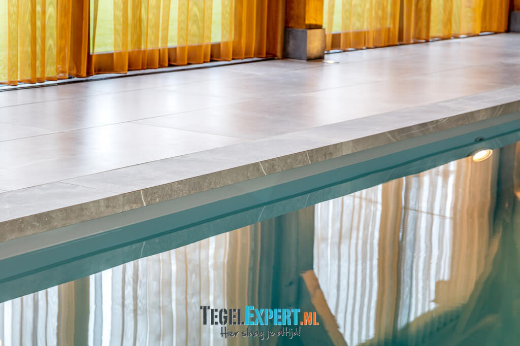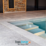Als laatste het zwembad. Dit was onze grootste uitdaging van dit hele project. Iets wat we nog nooit eerder hadden gedaan, maar met behulp van de juiste vakmannen en adviseurs, zijn wij trots op het resultaat. De klant koos voor een mooie natuursteen look tegel. Deze tegel is perfect geschikt voor natte ruimtes omdat hij wat stroef aanvoelt. Grappig feitje: het laatste stukje plint is zwemmend aangebracht. Het zwembad moest al worden gevuld, maar we waren nog niet helemaal klaar. Gelukkig deed de tegelzetter niet moeilijk en ging hij graag de uitdaging aan.