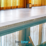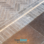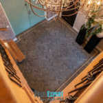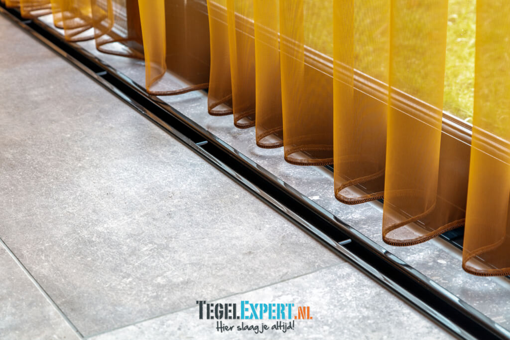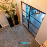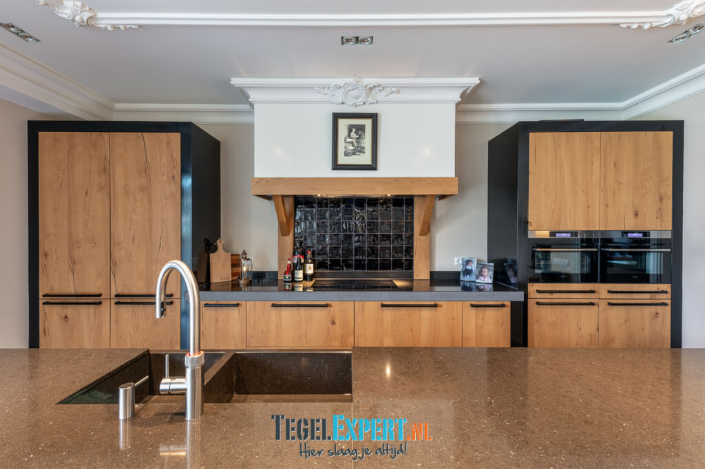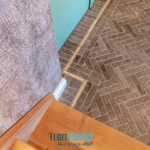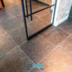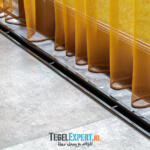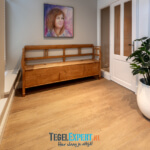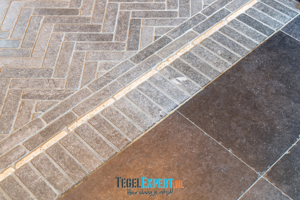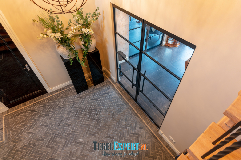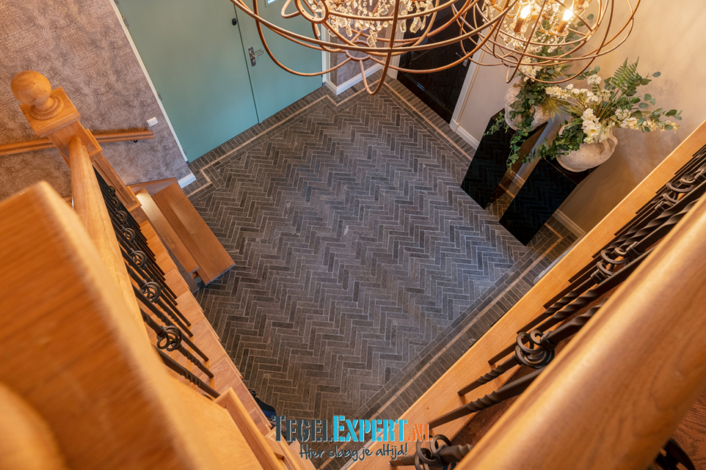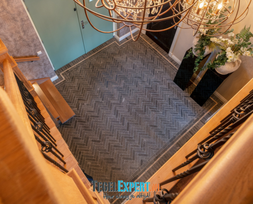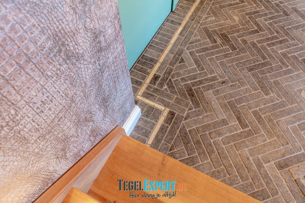 Bij binnenkomst zien we in de hal een mooie visgraat vloer van waaltjes met nog een mooi accent in de rand. De waaltjes zijn dikker dan alle andere tegels en daardoor moest alles nauwkeurig op elkaar afgestemd worden. De dekvloer moest daarom dus lager komen dan de rest van de woning. Op de foto kan je het resultaat zien en dat de vloeren exact op elkaar aansluiten.