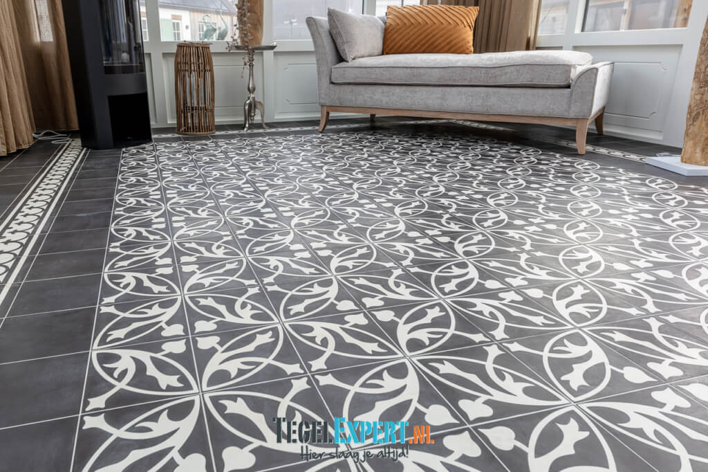 In de serre zien we een prachtige patroonvloer. Deze is gelegd met handgemaakte Portugese cementtegels. Een echte eyecatcher in deze woning die wij niet snel zullen vergeten. Elke tegel is vooraf ingetekend en uitgeteld om zo het patroon zo mooi mogelijk uit te laten komen naar wens van de klant.