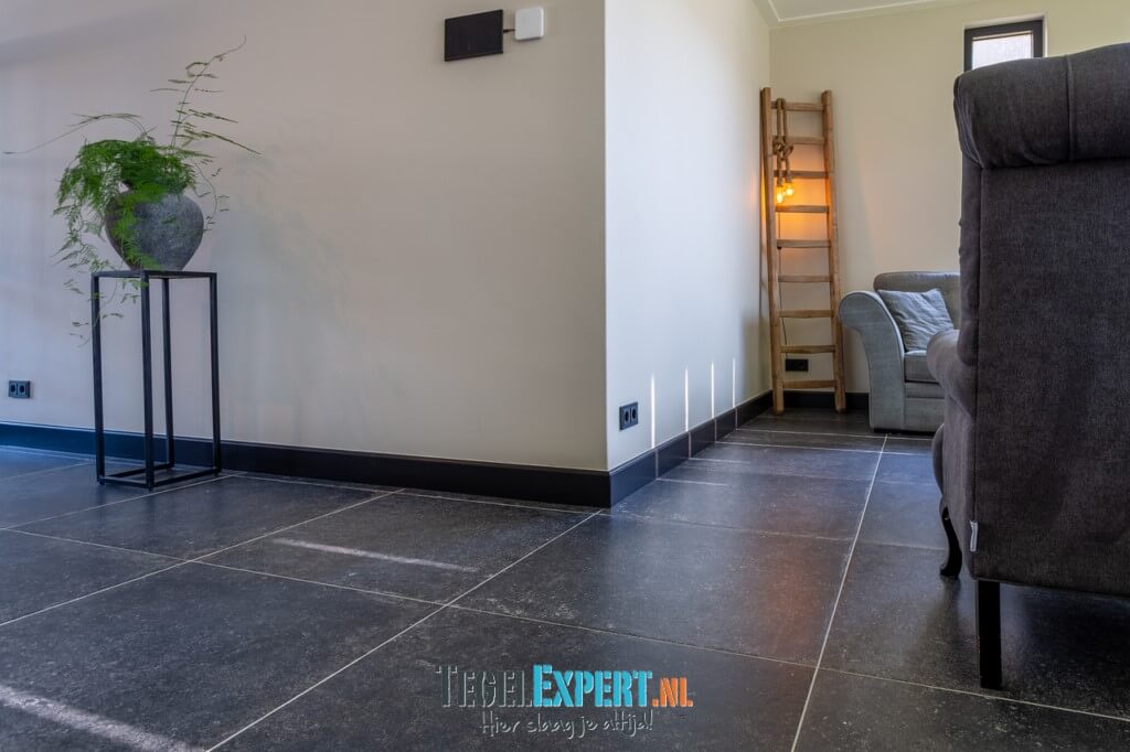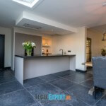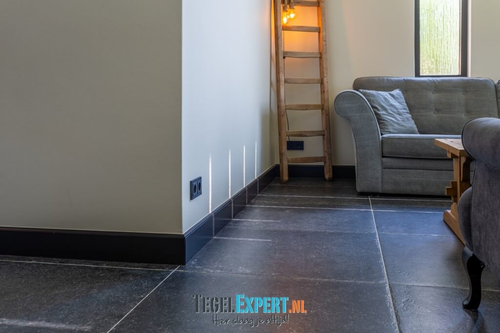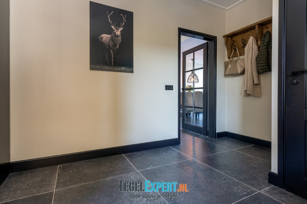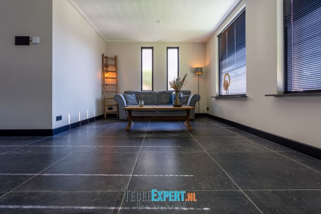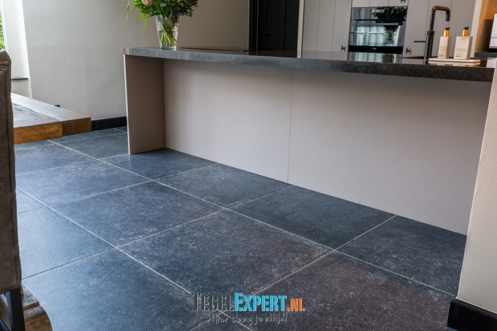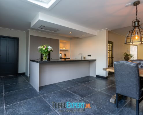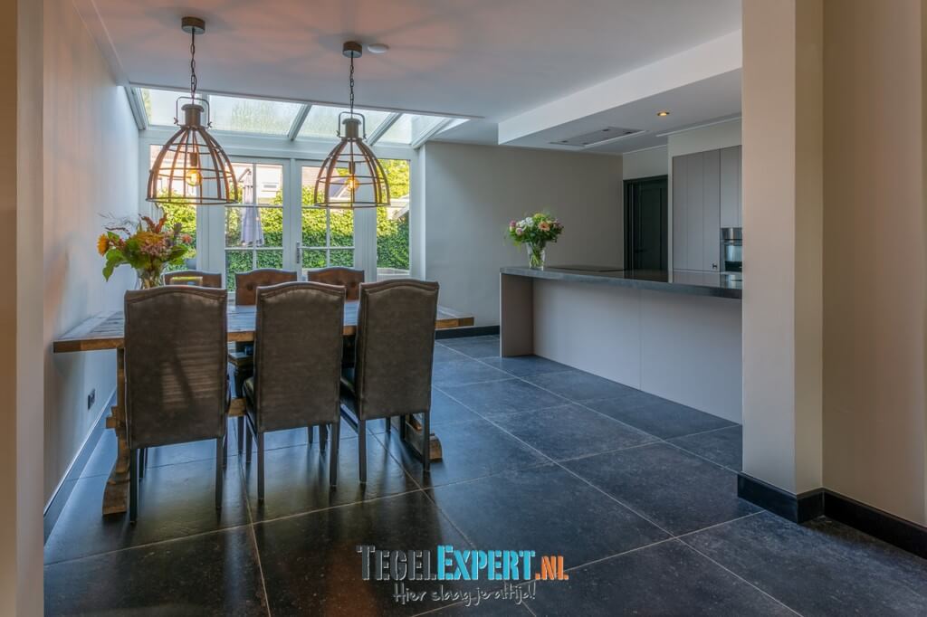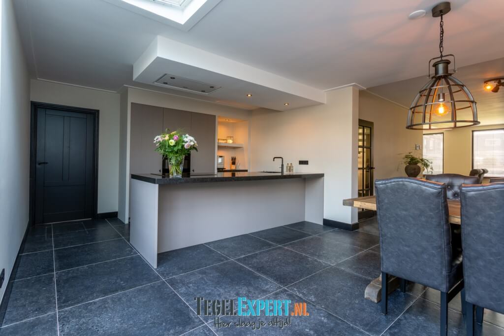 Met deze prachtige vloer geef je je interieur zowel een strakke, stoere als landelijke look. Bij deze klant hebben we de tegels gelegd met een smalle voeg wat zorgt voor een strak effect. Op de foto’s zien we dat dit is gecombineerd met een strakke industriële aankleding en landelijke meubels.