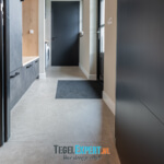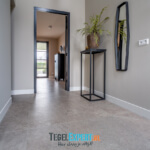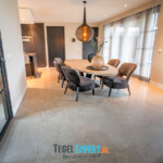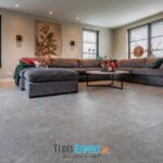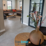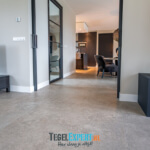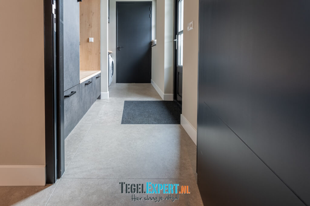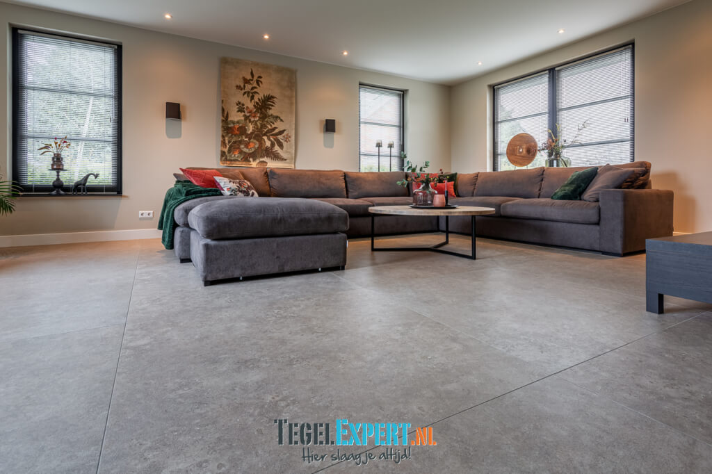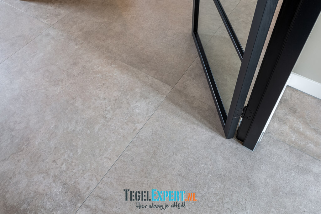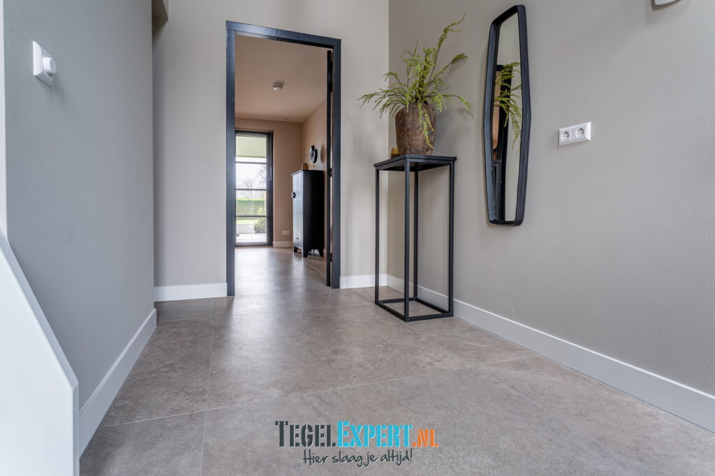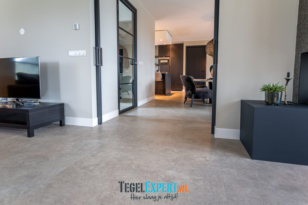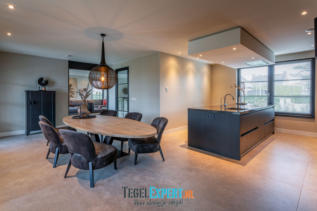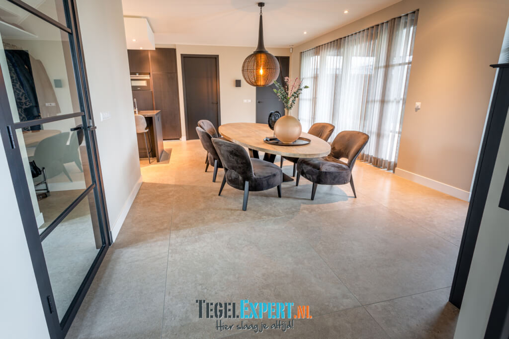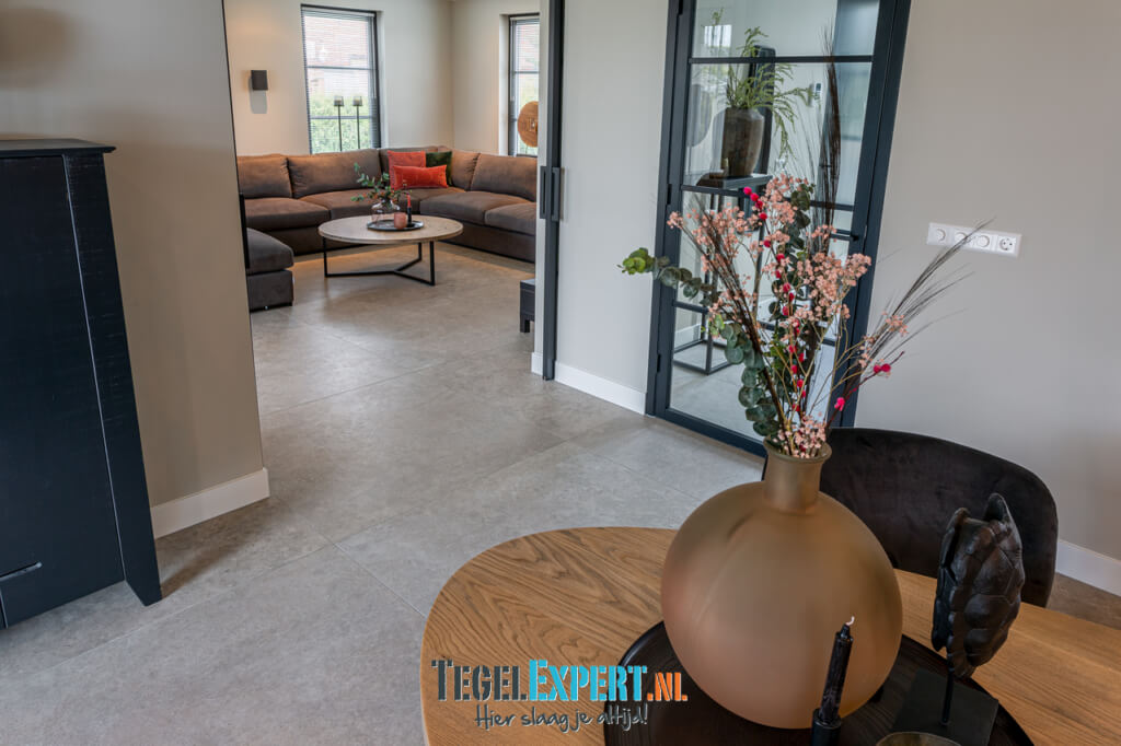 Deze prachtige natuursteenlook vloer in warm grijze kleur mag er absoluut zijn! De keramische tegels geven een rustige en natuurlijke uitstraling aan je interieur. In deze woning is gekozen voor het formaat 120×120 cm. Dit is het grootste formaat in de collectie en geeft een ruimtelijk gevoel aan alle kamers in het huis, van de eetkeuken tot de hal.Uiteraard zijn er ook andere formaten beschikbaar, zoals 60×120 cm, 60×60 cm en 30×60 cm.