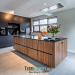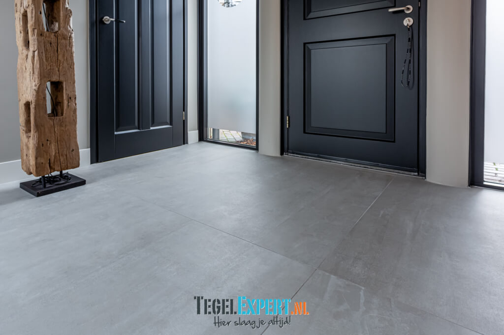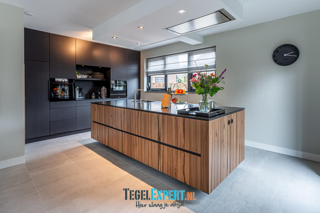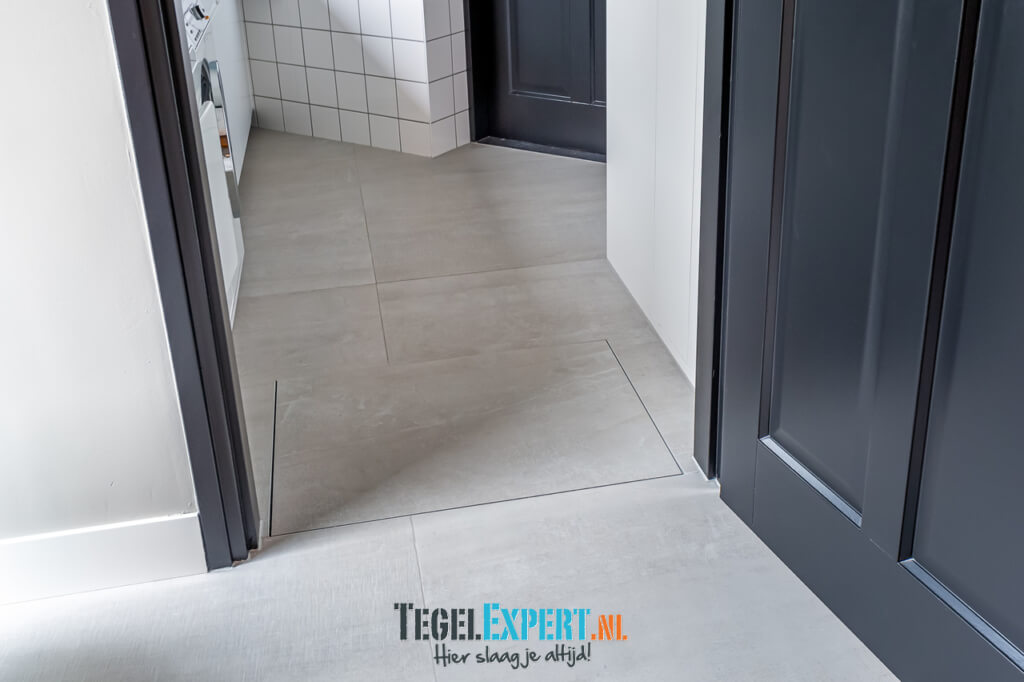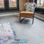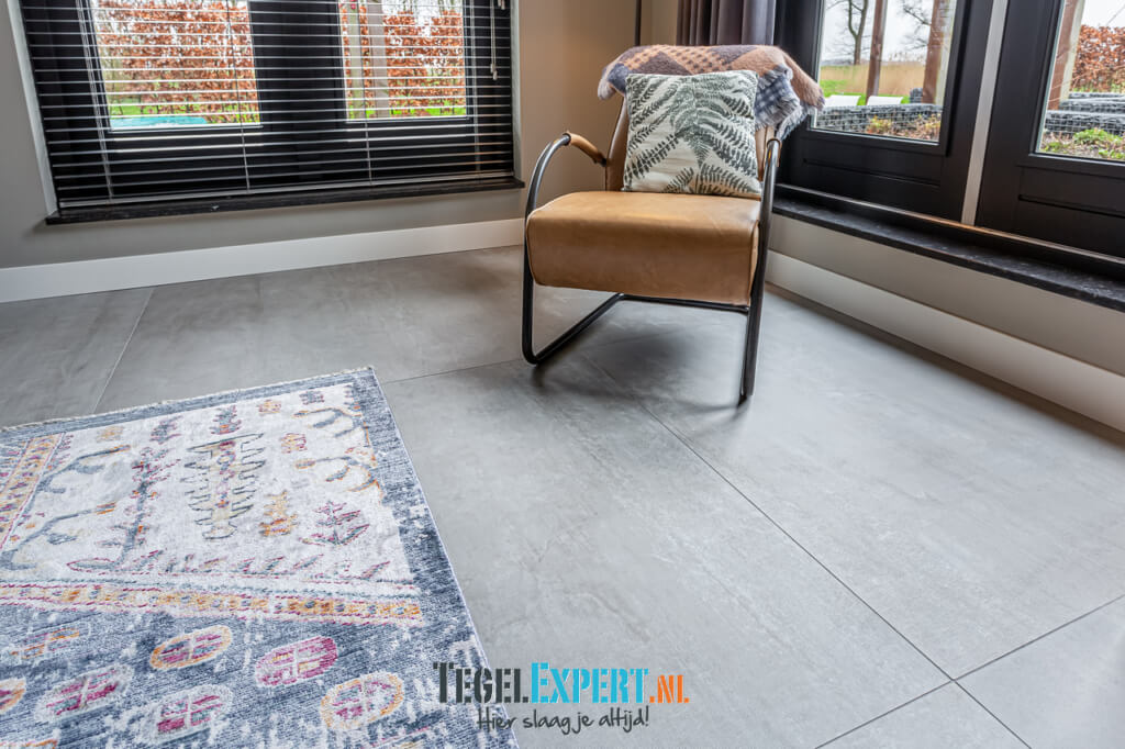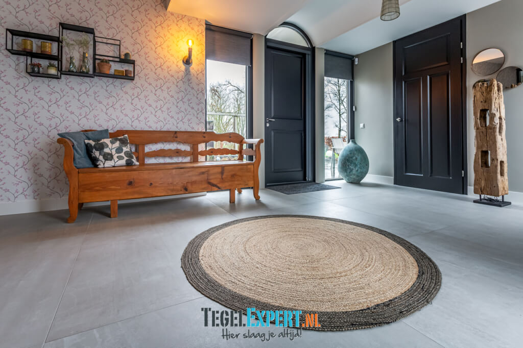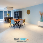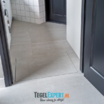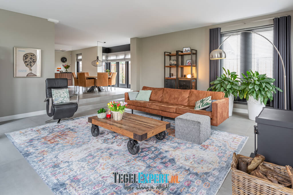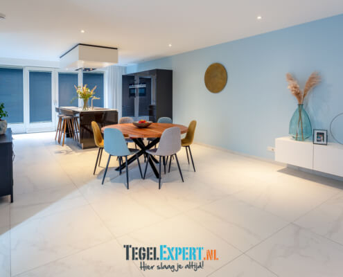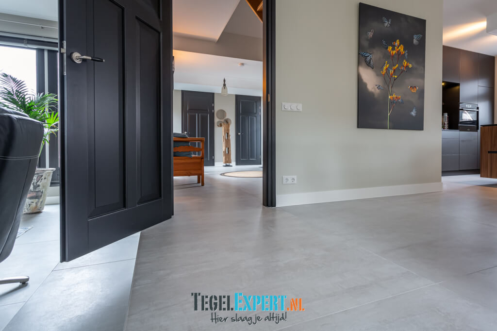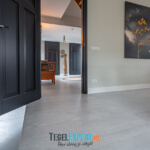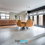 In deze woning is gekozen voor een 120×120 cm formaat. Deze grote tegel die in de gehele woning doorloopt, laat de ruimten prachtig in elkaar overlopen en geeft het een ruimtelijke aanblik.