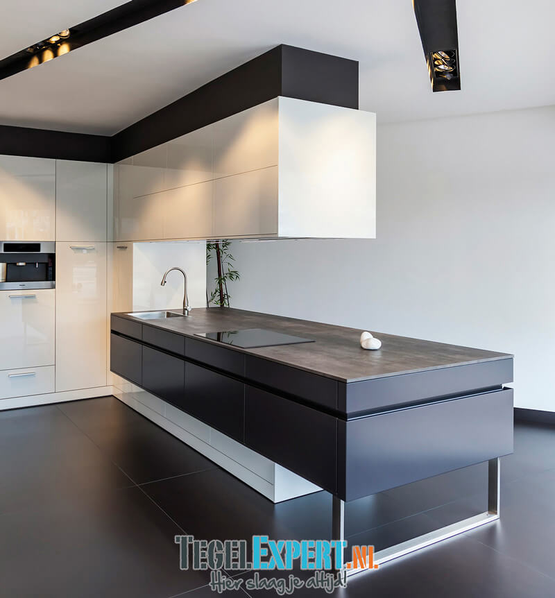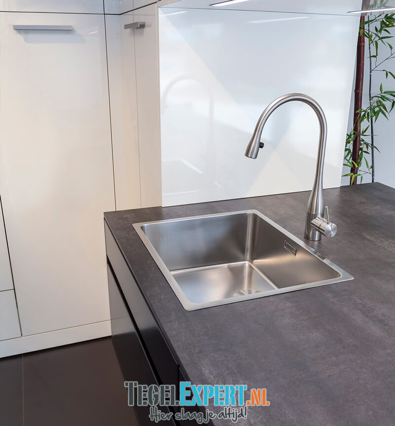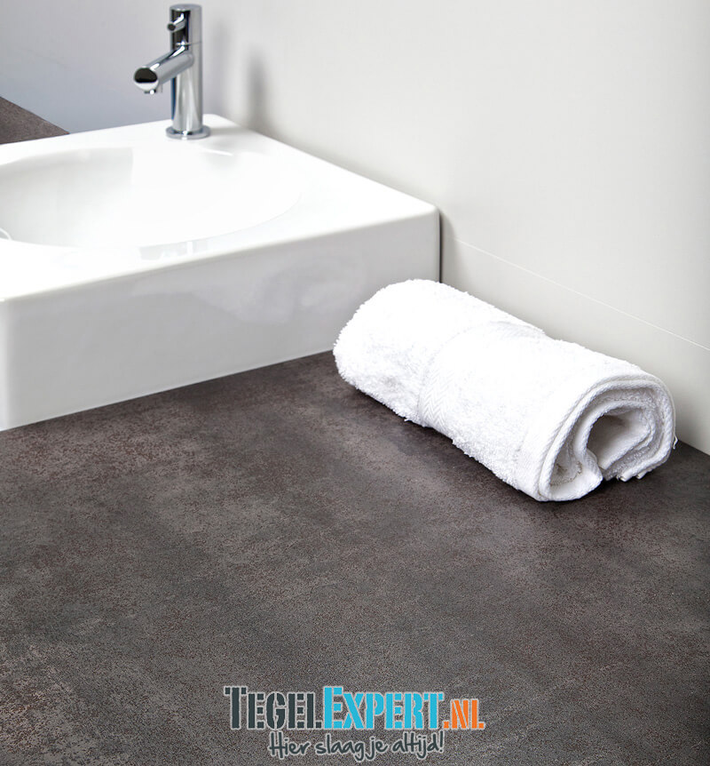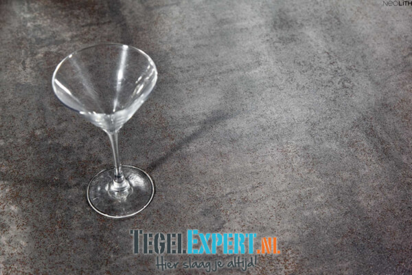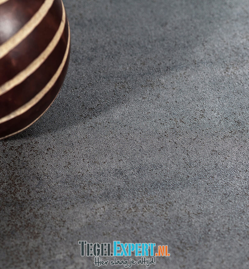 Dit is de Neolith Iron Grey, een metallook tegel van slechts 6 mm dik die zowel op de vloer als op de wand kan worden toegepast. Er zijn drie verschillende afmetingen leverbaar: 60 x 60, 60 x 120 en het extreme formaat 120 x 120 cm.