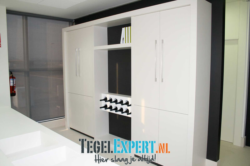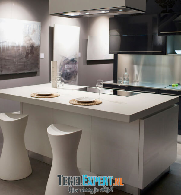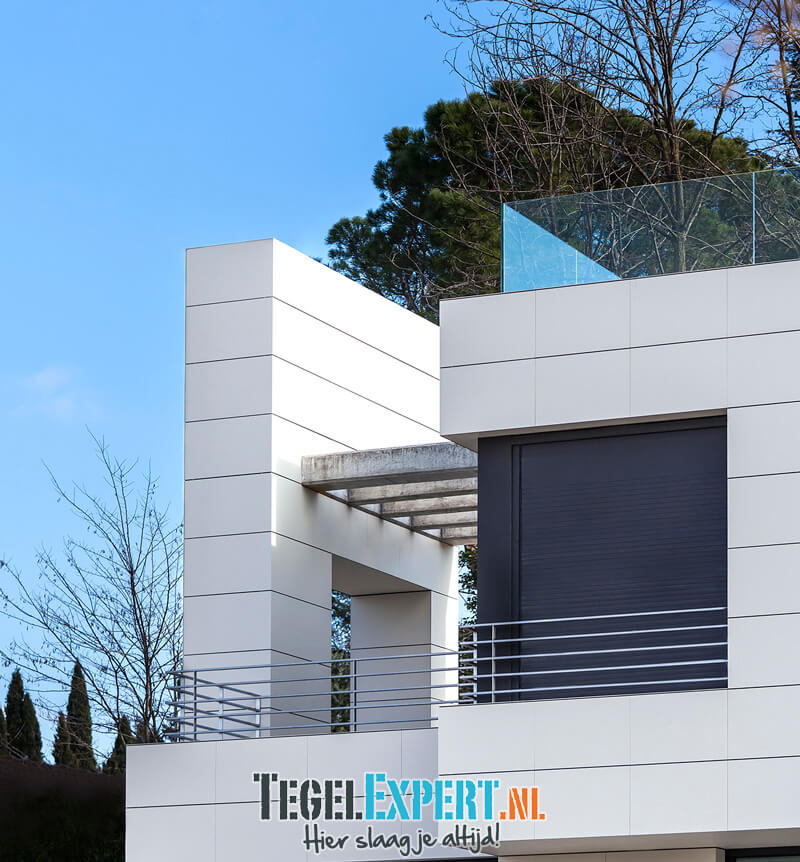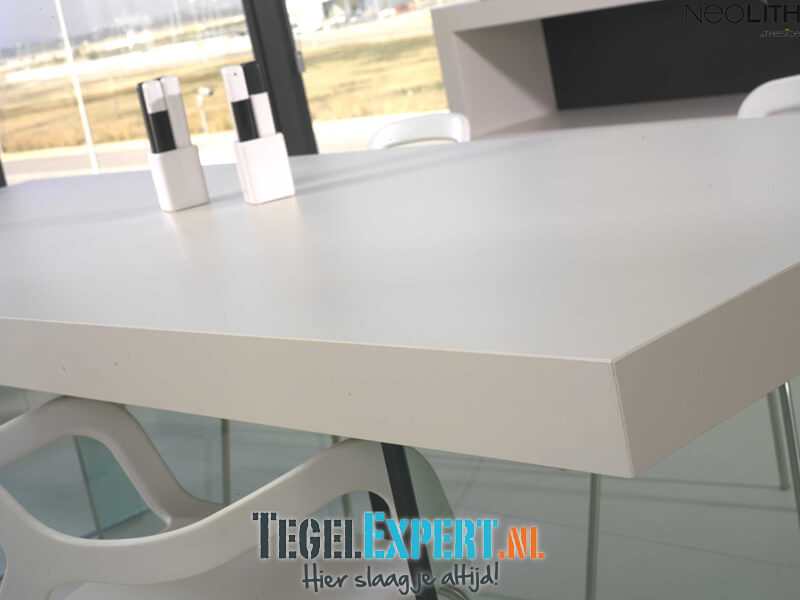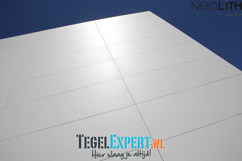 Dit is de Neolith Nieve, een spierwitte tegel van slechts 6 mm dik die zowel op de vloer als op de wand kan worden toegepast. Er zijn drie verschillende afmetingen leverbaar: 60 x 60, 60 x 120 en het extreme formaat 120 x 120 cm.