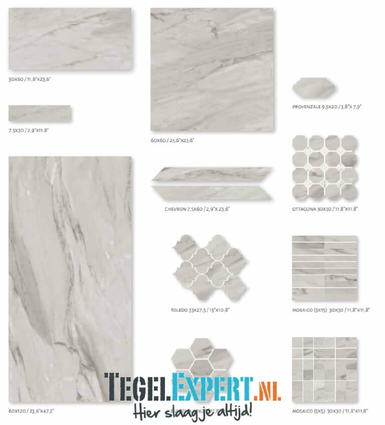 | Afmeting | Battiscopa 8×60 cm, Chevron 7,5×60 cm, Esagona(t.7) 30×28 cm, Grad.cretta 30x120x3x3 cm, Lapprett 30×60 cm, Lapprett 60×120 cm, Lapprett 60×60 cm, Lapprett 7,5×30 cm, Mos.(3×15) 30×30 cm, Mos.(5×5) 30×30 cm, Ottagona (t3 30×30 cm, Provenzale 9,5×20 cm, Toledo (t.8) 33×27,5 cm |